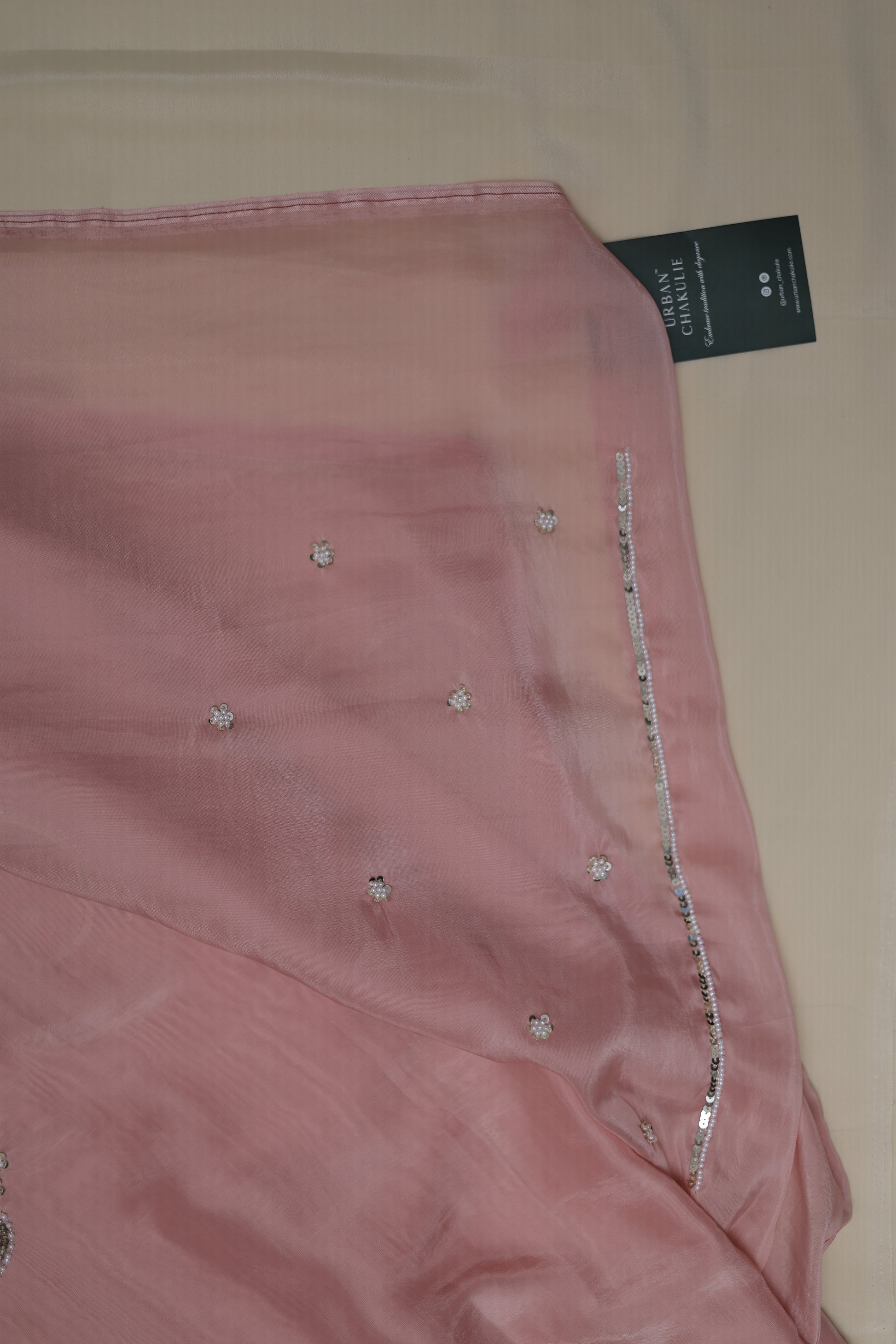 This fully hand-embroidered Autumn crepe 6-meter saree paired with a 1-meter matching blouse is a stunning example of fine craftsmanship and elegance. Made from soft and flowy autumn crepe fabric, the saree features intricate hand embroidery all over, making it rich in detail and texture. The embroidery is done using white beads, rose gold tikki, and kasab work (metallic thread), creating a beautiful balance of shimmer and sophistication. The blouse, crafted from the same fabric, complements the saree perfectly with matching hand embroidery that enhances its overall appeal. Ideal for weddings, festive occasions, or special events, this saree set showcases timeless beauty and luxurious artistry.